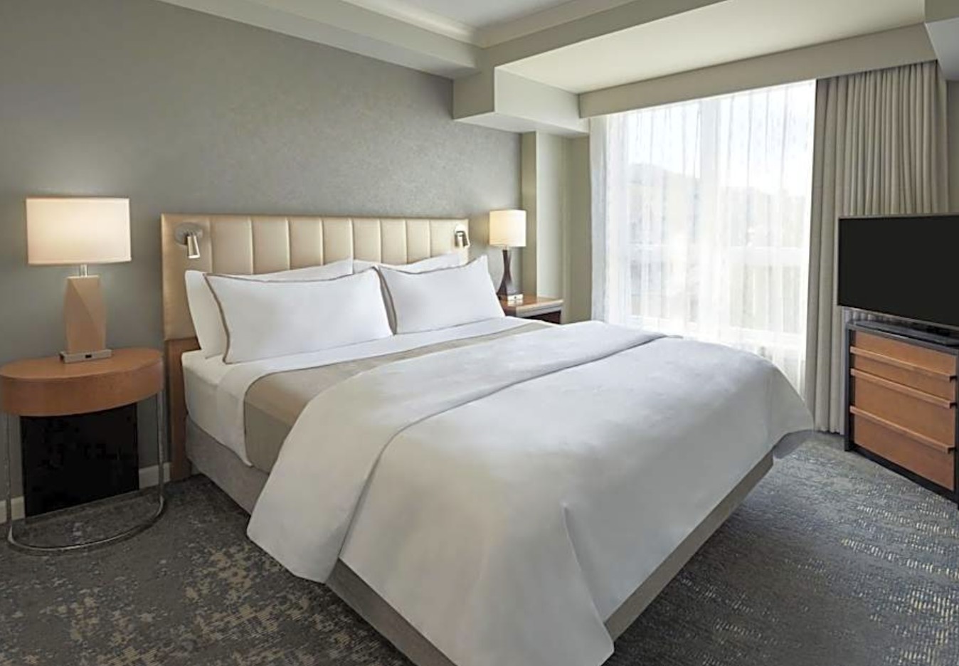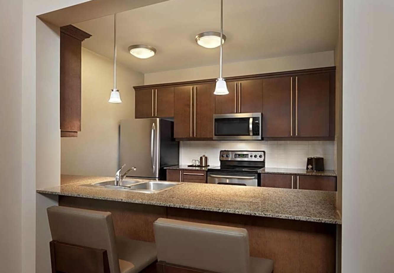 Two Bedroom Trillium Suites provide more room and privacy in an open-concept space. Each unit offers guests full kitchen facilities. Living area with sofa, arm chairs, fireplace and flat screen TV. Bedding in the unit consists of king-sized Heavenly bed in 1st bedroom, queen-sized bed in second bedroom and one double sofa bed. Two bedroom Trillium suites have two bathrooms.