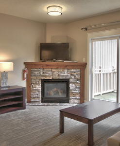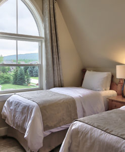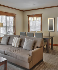 Spacious townhome units with full kitchen facilities, open-concept living area with sofa, arm chairs, fireplace and flat screen TV. Bedding in the unit consists of one queen in the first and 2nd bedrooms. The third bedroom includes twin beds. The living room sofa also converts into a double or queen bed. Three bedroom townhome villas feature two bathrooms, one of which is an en-suite.