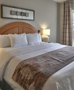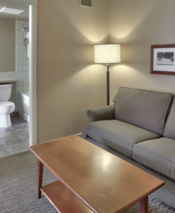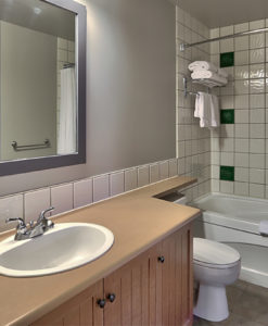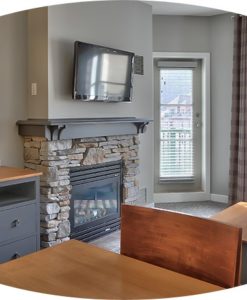 One bedroom suites with den provide more room and privacy in an open-concept space. Each unit offers guests full kitchen facilities, fireplace and flat screen TV. Living area with sofa sleeper and also separate den with additional sleeper as well. Bedding in the unit consists of one queen in a private bedroom and two double sofa beds. One bedroom suites have only one bathroom.