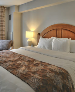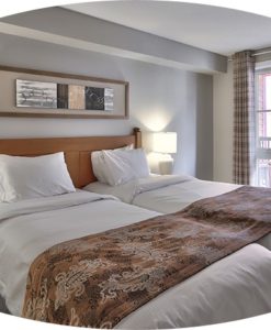 Beautifully spacious suites with full kitchen facilities, open-living area with sofa, arm chairs, fireplace and flat screen TV. One queen or king bed in the first bedroom and one queen or two twin beds in the second bedroom, as well as a pull-out sofa in the living room. Two bedroom suites feature 2 bathrooms and full kitchen consisting of: fridge, stove, microwave, coffee maker, toaster, dishwasher, dishes, glassware, cutlery, sink, sofa bed, table and chairs.
