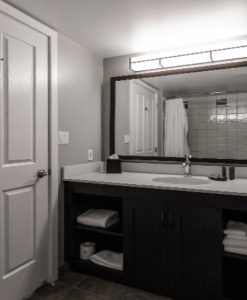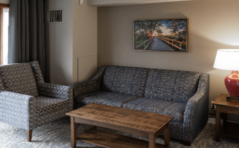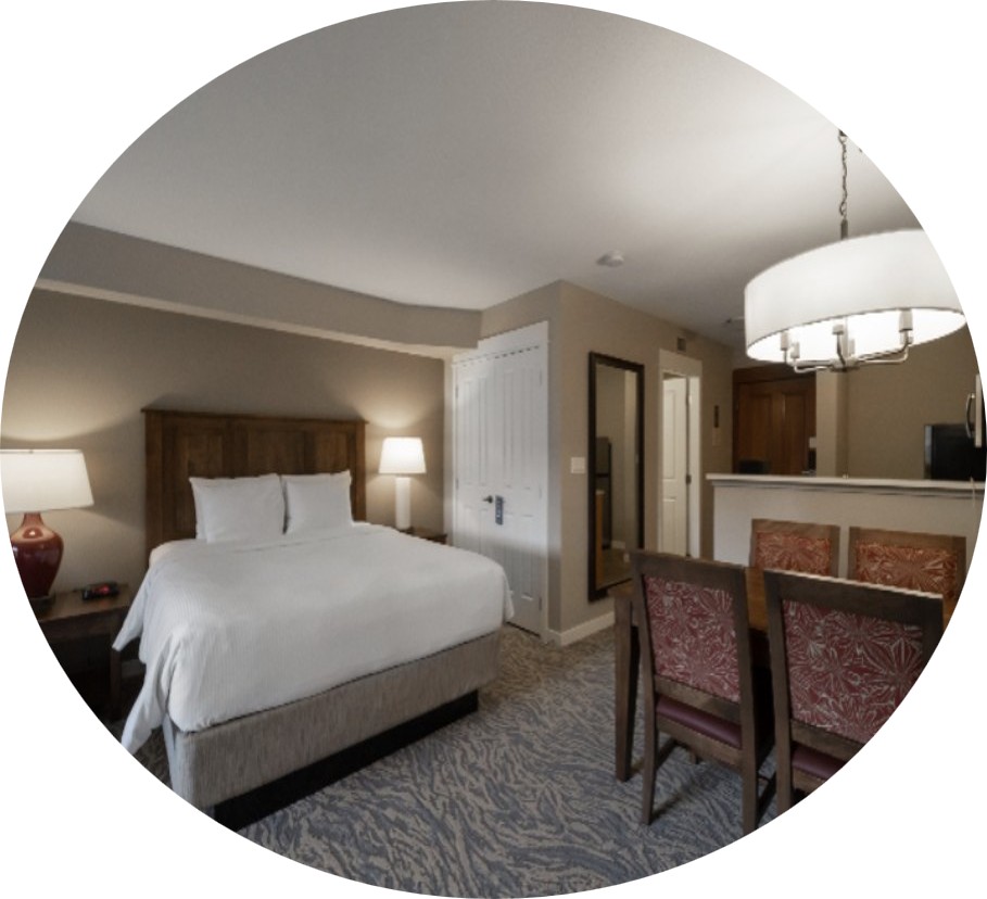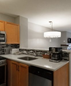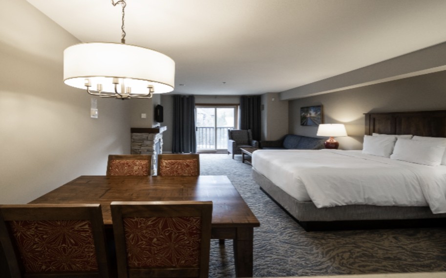 Rooms located in Grand Georgian, Seasons and Weider Lodge. Open-concept units offer guests full kitchen facilities. Bedding in the unit consists of one queen bed and a sofa bed. Each bachelor suite has one bathroom.
