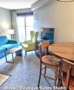 These sleek, self-contained suites offer open concept living area featuring a kitchenette with dishwasher. Bedding in the unit consists of one queen bed and one double sofa bed. Each suite has one bathroom