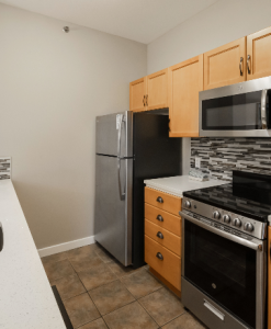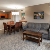 Full kitchen facilities, open-concept living area with sofa, arm chairs, fireplace and flat screen TV.